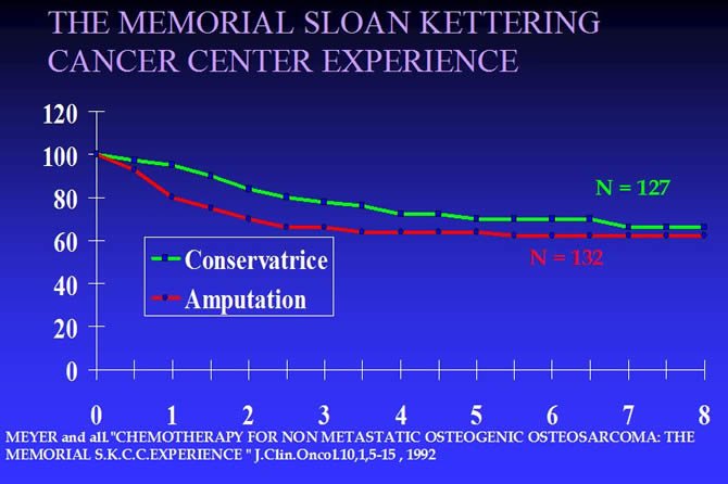 Depuis 20 ans, grâce aux progrès de la chimiothérapie, de l'imagerie médicale et des techniques chirurgicales, elle peut être réalisée en conservant le membre sans diminuer les chances de guérison ainsi que le prouvent toutes les études réalisées sur le sujet dont les plus connues sont rappelées sur les courbes ci jointes.