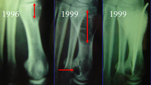 En 1999, la lésion de l'orteil évolutives sur les radiographies successives et devenue douleureuse et traitée par comblement ciment.